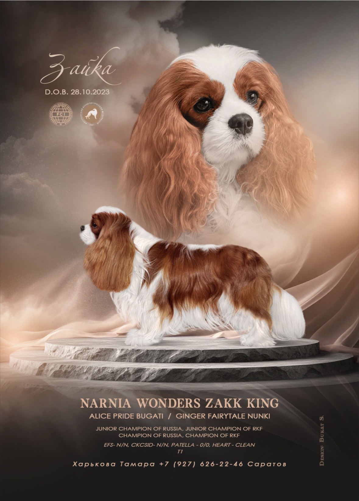 | |  | Кличка: | NARNIA WONDERS ZAKK KING | | Дата рождения: | 28.10.2023 | | Пол | Кобель | | Окрас: | Бленхейм | | Место рождения: | Россия | | Питомник (Заводчик): | NARNIA WONDERS | | Заводчик: | Кудрявцева Галина | | Место проживания: | Россия | | Город: | Саратов | | Питомник (Владелец): | | | Владелец: | Харькова Тамара | | Отец: | ALICE PRIDE BUGATI | | Мать: | GINGER FAIRYTALE NUNKI | | Вес: | 6.800 кг. | | Рост: | 29 см. | | Тест характера: | | | Клеймо: | | | Организация: | FCI | | Титулы: | ЮЧР ЮЧРКФ ЧР ЧРКФ |